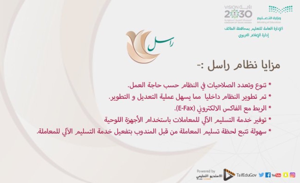 مدينة الطائف No Twitter تعليم الطائف يدشن نظام راسل البوابة الرئيسية لاستقبال وإرسال جميع المعاملات الخاصة بإدارة التعليم والإدارات التابعه لها ومكاتب التعليم والمدارس الطائف Https T Co Plti6pusc6